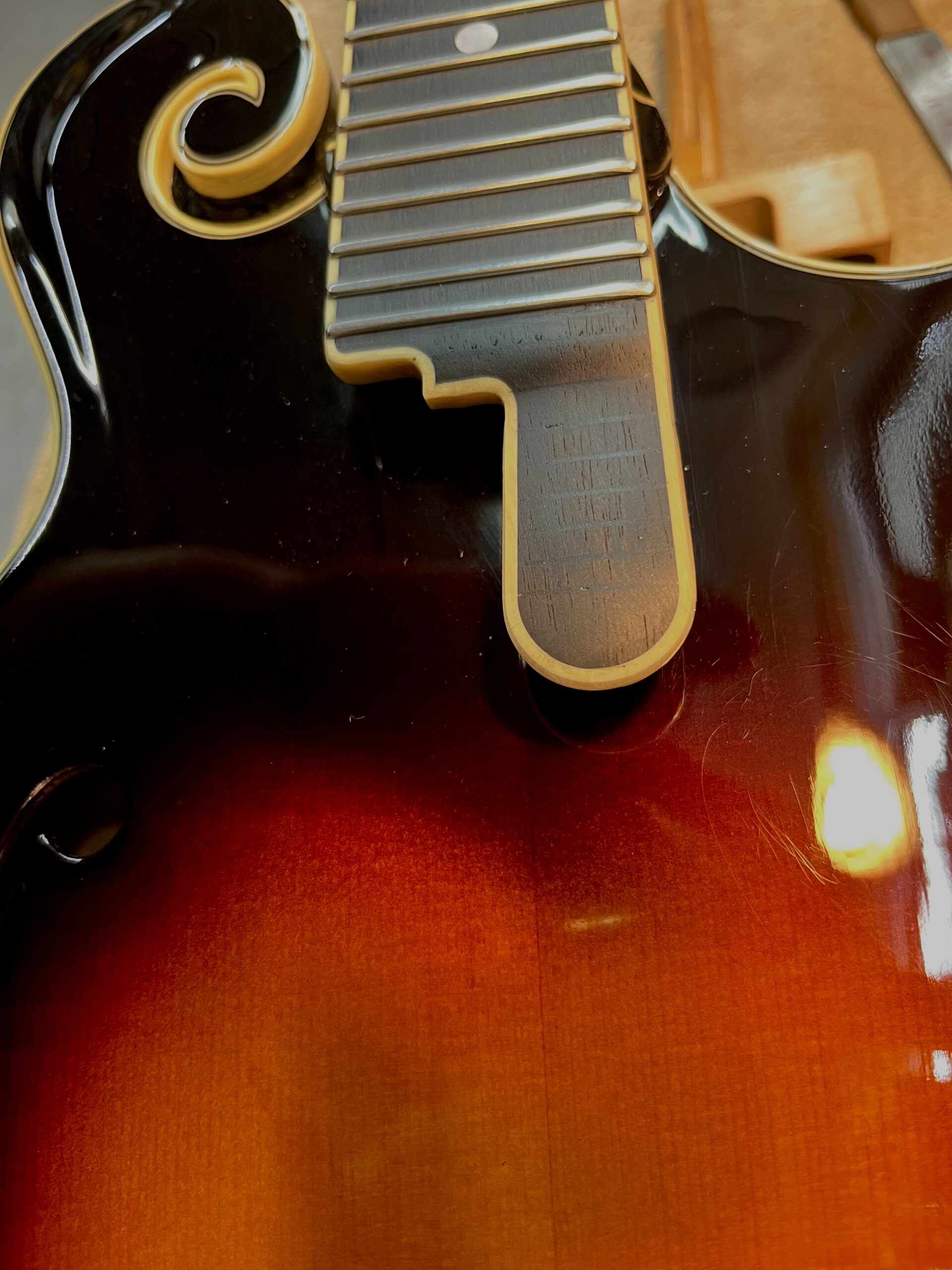 Traveler #25 is a masterpiece, truly the “Presidential Model.” It arrived safely via USPS, rested overnight, and awakened today. Where do I begin? The woods are beautiful, and the finish and binding bring out their character. It sparkles. The binding, by the way, is extraordinary. Gold hardware complements the woods and finish, and the scalloped tailpiece lends itself perfectly to the shape of the mandolin. It is an aesthetic celebration. The tone is phenomenal, and the low, easy setup allows me to bring out the tone as if the instrument were already played in, that’s how refined it is already. When you mentioned that it is very easy to play you understated it: the radiused fretboard and setup give it an effortless feel. I love the way that #25 nestles in my hand; I need to look to see that it’s really there. Traveler #25 embodies the Zen of mandolin playing!